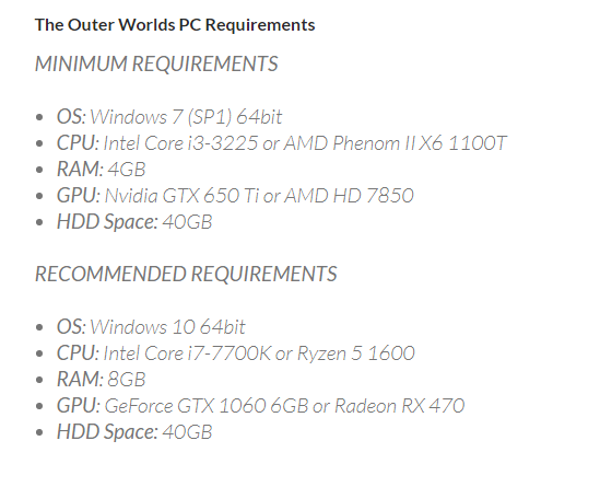 더 아우터 월드 PC의 요구사항은 다음과 같습니다.