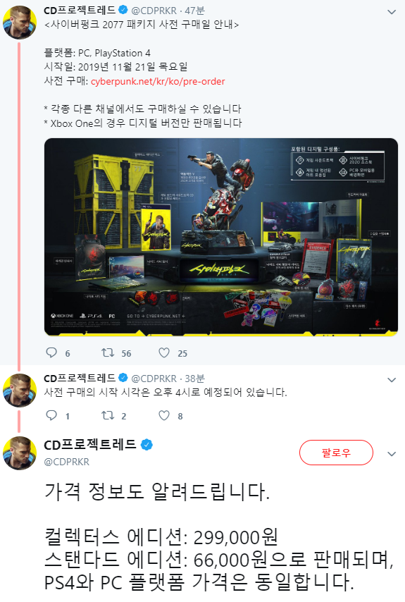 사이버펑크 2077의 사전 예약 일시와 에디션 별 가격이 공개되었습니다.