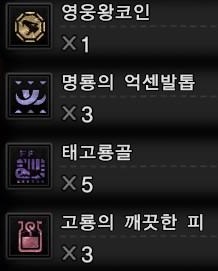재료 명 : 절친의 증표 x3, 명룡의 환요수염 x2, 뇌랑룡의 뇌전갑각 x3, 대용옥 x1
