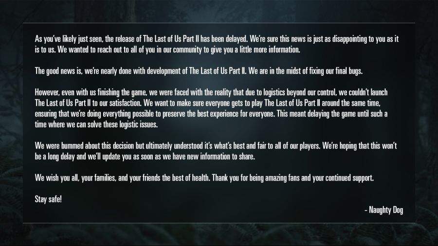 "여러분들이 방금 소식을 접했다시피, The Last of Us Part II의 출시 일정이 연기되었습니다. 이 슬픈 소식이 여러분들과 저희 모두에게 실망스러울 거라는 것을 잘 알고 있습니다."